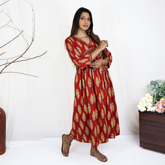 SRISHTI Pure Cotton Block Print, Red Long Tunic/Kurta Dress Regular and Plus Sizes