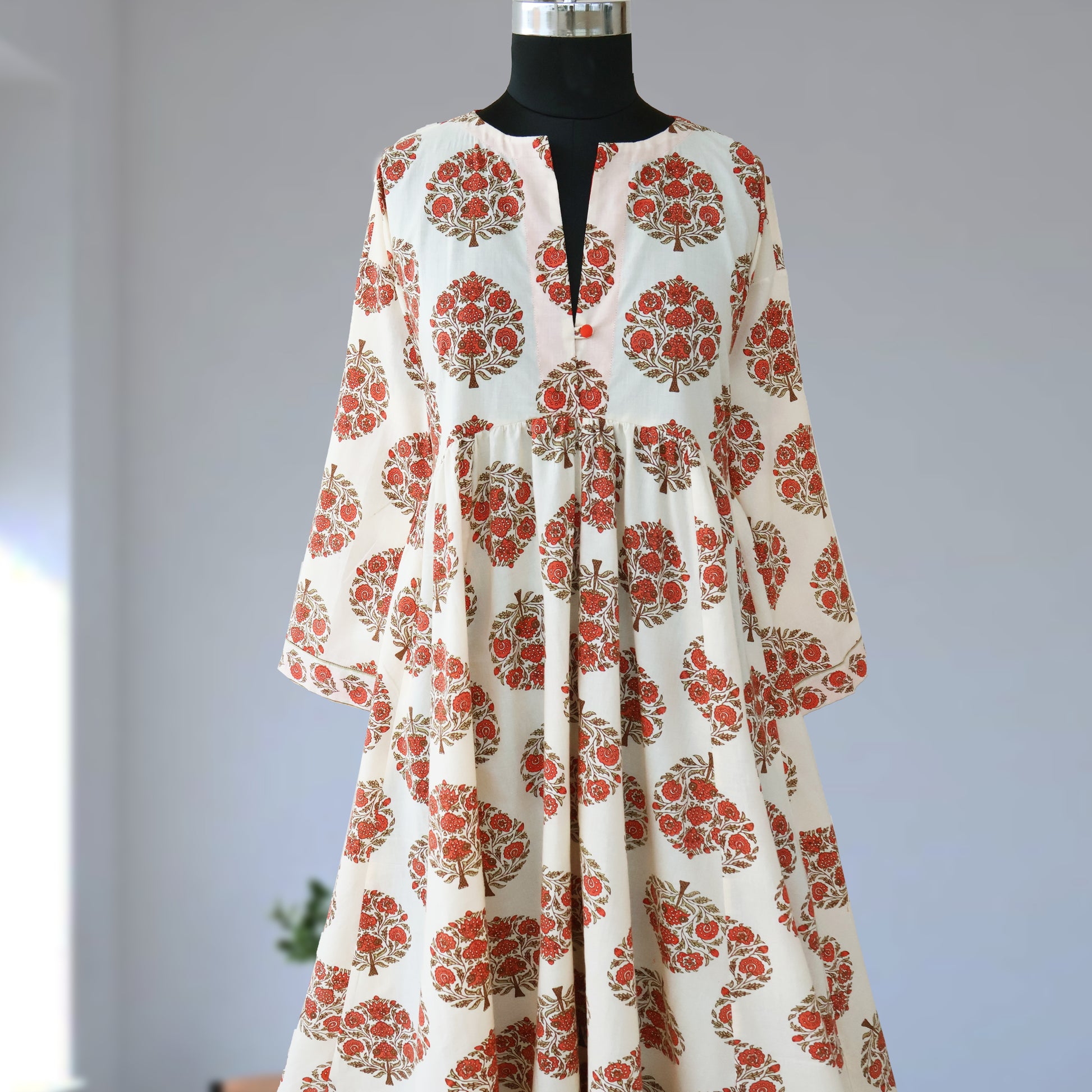 DEVIKA prt Block Printed Pure Cotton Women Long Flared Kurta Tunic Dress